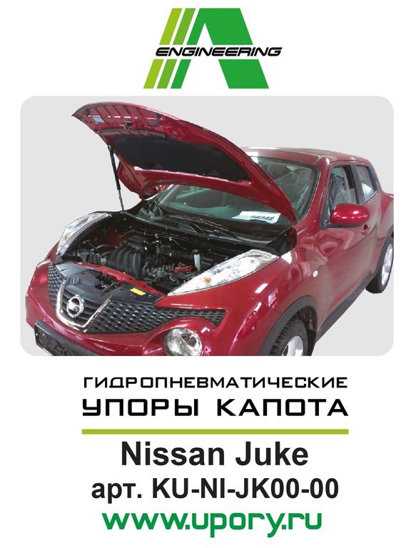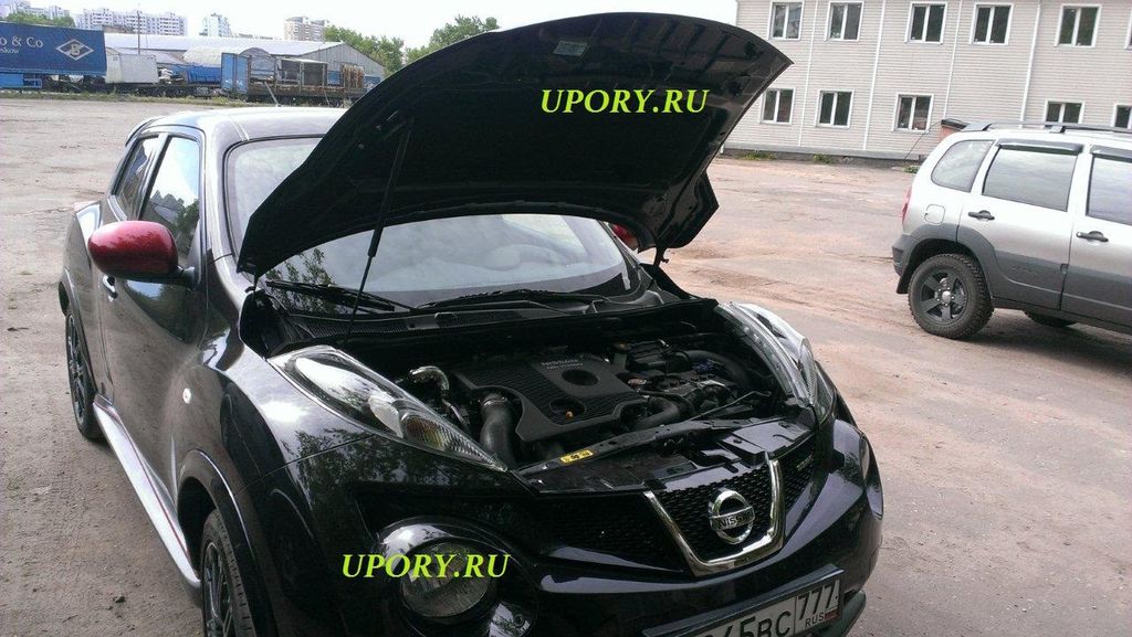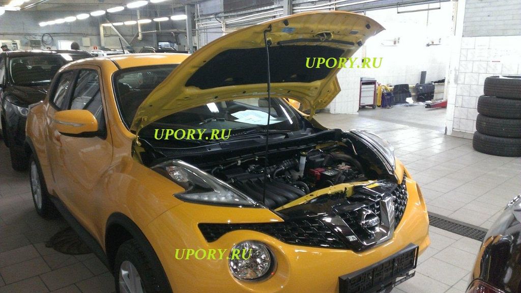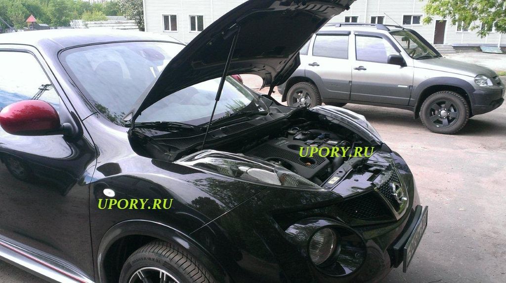 Установочный комплект амортизаторов (упоров) капота для автомобиля Nissan Juke, монтируется без доработки автомобиля (без сверлений отверстий в кузове и капоте, без использования заклепок) и не требует специального обслуживания.