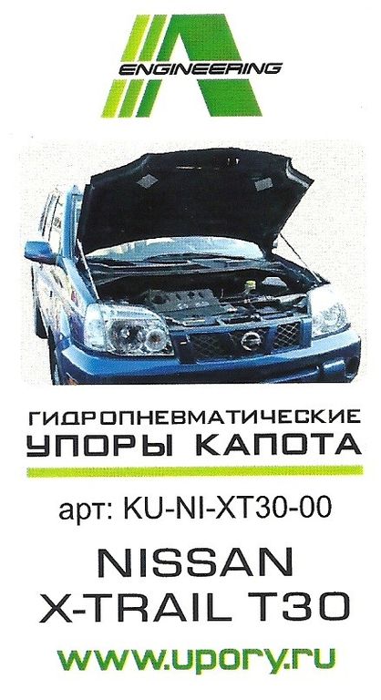 Установочный комплект амортизаторов (упоров) капота для автомобиля Nissan X-Trail T-30, монтируется без доработки автомобиля (без сверлений отверстий в кузове и капоте, без использования заклепок) и не требует специального обслуживания.