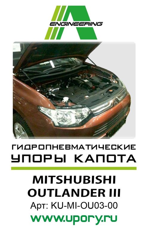 Установочный комплект амортизаторов (упоров) капота для автомобиля Mitsubishi Outlander III, монтируется без доработки автомобиля (без сверлений отверстий в кузове и капоте, без использования заклепок) и не требует специального обслуживания.